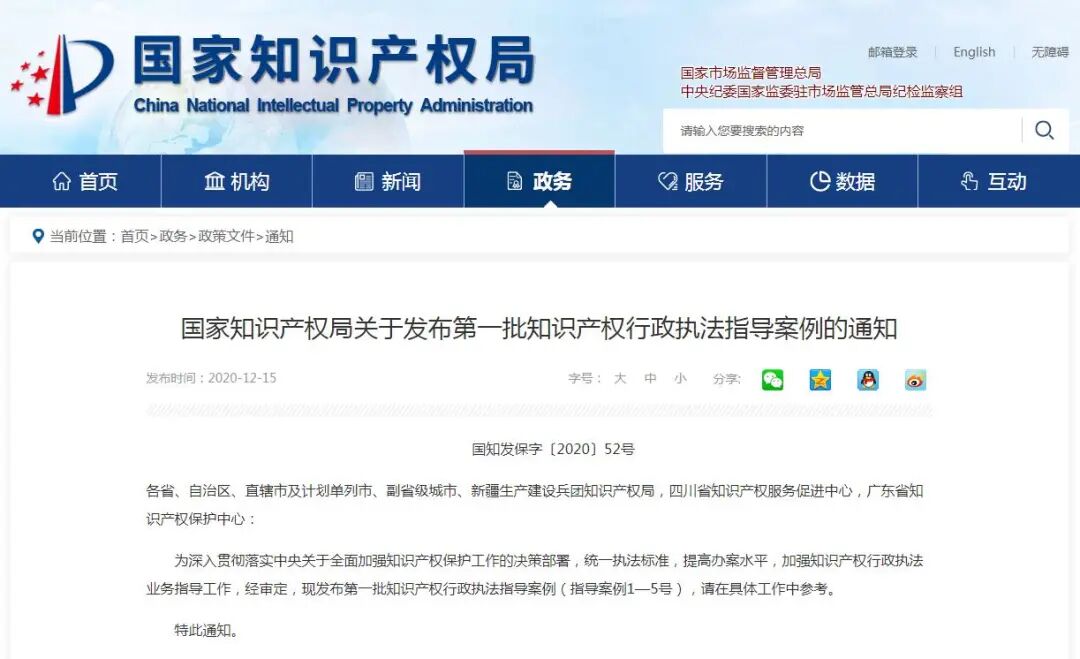 国家知识产权局关于发布第一批知识产权行政执法指导案例的通知